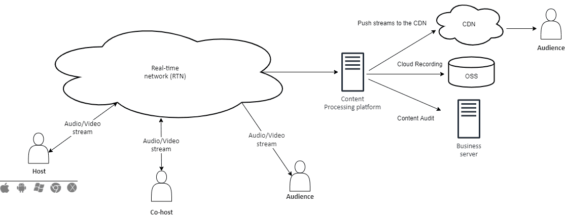 | Live Streaming | Stream pushing to CDN | Push audio/video streams in a room to other RTMP servers and distribute them by CDN (distribution should be supported by the third-party) | Social sharing in interactive live streaming |